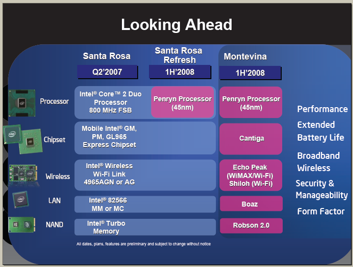 Ein sehr leichtes Aluminiumgehäuse, der Verzicht auf ein optisches Laufwerk, SSD-Speicher und vorallem Intels neue Notebookplattform Montevina (siehe Grafik oben) sollen zum Einsatz kommen. Diese kleine und stromsparende Bauteile würden im Endeffekt dieses Wunschkonzept realisierbar machen. Einziger Haken: Die Technik wird frühestens Mitte 2008 verfügbar sein, deswegen wird wahrscheinlich auch "nur" ein Prototyp gezeigt .
